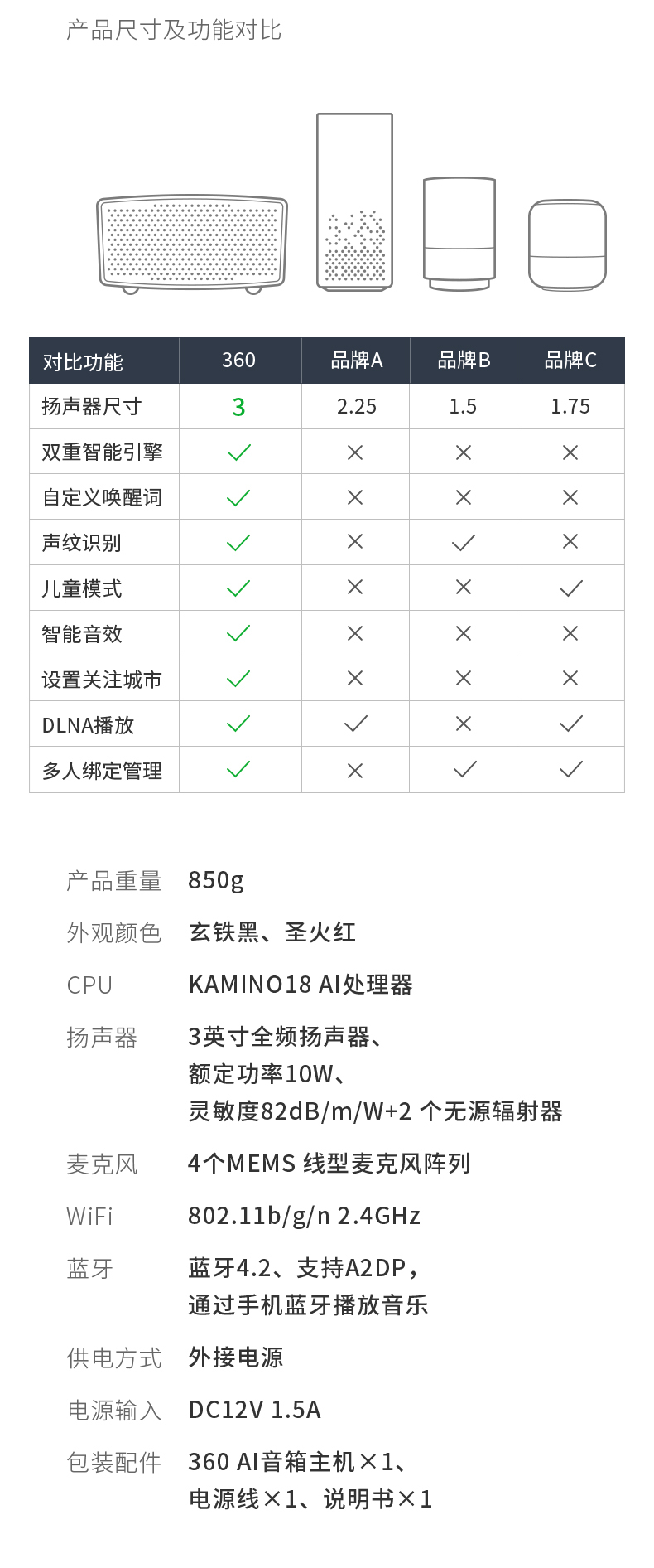 - 因为音箱需要时刻做计算,检测有没有唤醒它,所以即使没有播放音乐CPU也是一直在运行的,会有些微热。目前市面上部分品牌的音箱在结构设计上CPU是在最内部,热量捂在里面散发不出来,外观可能感觉不到。而360 AI音箱为了让热量能够及时散发出来,将CPU设计在顶部按键下方,且增加了一个比较大的散热片,所以有微热感觉。实际使用时不会有影响,可放心使用。